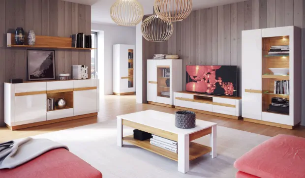 - Możliwość rozbudowy: Zacznij od szafki RTV i witryny, a komodę dokup w późniejszym terminie – gwarantujemy dostępność kolekcji.