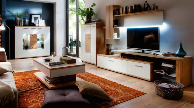 Reprezentacyjną część salonu warto wyposażyć w przeszklone witryny. To idealne miejsce na wyeksponowanie rodowej porcelany, kolekcji książek czy pamiątek z podróży, przy jednoczesnym zabezpieczeniu ich przed kurzem. Z kolei nasze szafki RTV zostały zaprojektowane z myślą o nowoczesnych technologiach – posiadają odpowiednie przepusty na kable i przestrzeń na dekodery czy konsole, pozwalając zachować estetyczny ład w strefie multimedialnej.